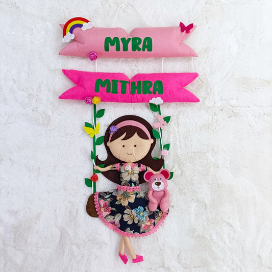Personalised Felt Hanging for Adorable Siblings on Swing with Rainbow