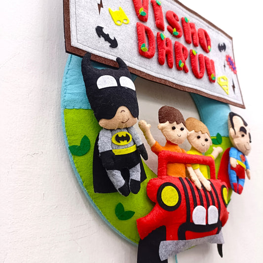 Kids in car with Superheroes | Personalised Felt Kids Hanging | Siblings