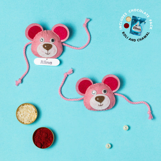 Pink Teddy Rakhi Combo with Chocolates, Roli and Chawal | Personalised Kids Rakhi