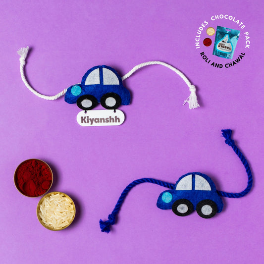 Car Rakhi Combo with Chocolates, Roli and Chawal | Personalised Kids Rakhi