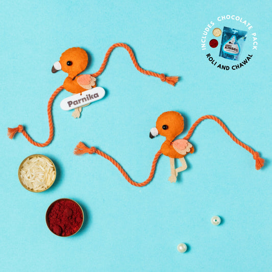 Flamingo Rakhi Combo with Chocolates, Roli and Chawal | Personalised Kids Rakhi