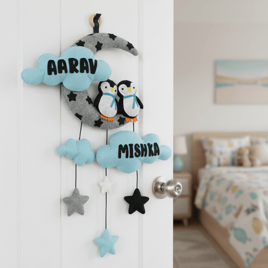Penguin with Moon and Cloud | Personalised Felt Kids Hanging | Siblings